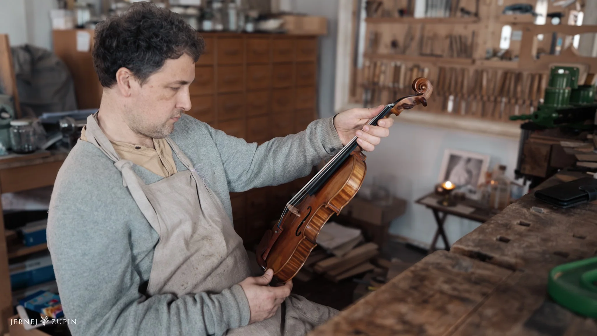Spodnje fotografije so nastale spontano, brez poziranja, z namenom ujeti neomajno osredotočenost, ki je potrebna za izdelavo tako kompleksnega instrumenta. Poudarjeni kontrasti svetlih in temnih odtenkov v delavnici dodatno izpostavijo misterioznost in čustven naboj, ki spremlja Danielov pristop k izdelavi violine.